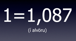 Sá sem seldi þér evrurnar er hinsvegar ekki eins lukkulegur því ef hann vill kaupa sér evrur fyrir krónurnar sem þú borgaðir honum þá fengi hann auðvitað bara tæpar 913 evrur í dag. Þannig að til að svara spurningunni um hvar þessar 87 evrur eru þá vil ég meina að það eru engar 87 evrur í spilinu, það eru bara “mínus 87” evrur og þessar mínus evrur eru (ekki) í vasanum hjá aðilanum sem seldi þér evrurnar fyrir krónur fyrsta apríl.