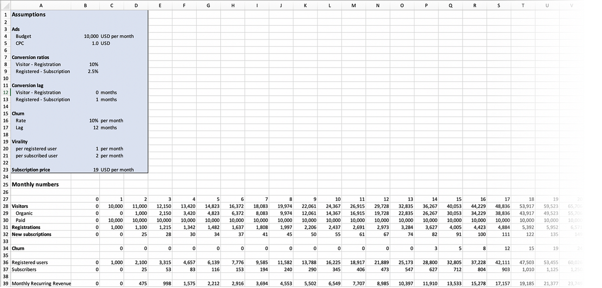 for (let i = 1; i<37; i++) { series.paid.push( budget / cpc ); series.organic.push( viralperreg * series.registered_users[i - 1] + viralpersub * series.subscribers[i - 1] ); series.visitors.push( series.paid[i] + series.organic[i] ); series.registrations.push( series.visitors[Math.max(0, i - vrl)] * vrr / 100 ); series.new_subscriptions.push( series.registrations[Math.max(0, i - rsl)] * rsr / 100 ); series.churn.push( series.subscribers[Math.max(0, i - churnlag)] * churnrate / 100 ); series.registered_users.push( series.registered_users[i - 1] + series.registrations[i] ); series.subscribers.push( Math.max(0, series.subscribers[i - 1] + series.new_subscriptions[i] - series.churn[i] ) ); series.MRR.push( Math.round(series.subscribers[i] * price) );}