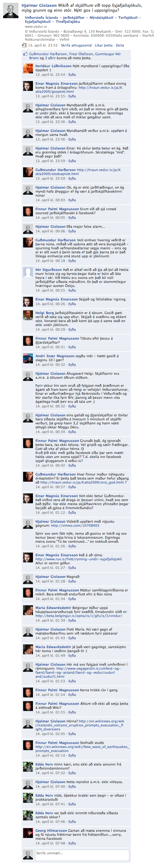 Mér fannst ástæða til að bjarga þessum þræði áður en hann félli í gleymsku Facebook-fortíðar. Það var býsna áhugaverð upplifun að fylgjast beinlínis með upphafi gossins í hópi nörda úr ýmsum áttum á Facebook og Twitter…