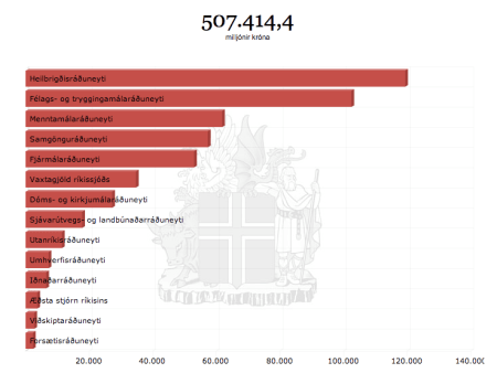 Fjárlagafrumvarp ársins 2009 var kynnt í dag. Frumvarpið sjálft er doðrantur sem fáir hafa undir höndum. Hægt er að lesa sig í gegnum frumvarpið á Fjárlagavef Fjármálaráðuneytisins, en það er ekki beinlínis aðgengilegt og ekki auðvelt að átta sig á stóru samhengi hlutanna. DataMarket brást skjótt...
