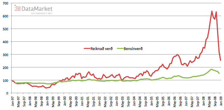 Ég hef áður gert nokkrar tilraunir með að draga upp mynd af bensínverði hér á landi miðað við þá þætti sem helst eru sagðir ráða verðmynduninni, þ.e. heimsmarkaðsverð á olíu og gengi bandaríkjadals. Nú hefur heimsmarkaðsverðið snarfallið, en gengið á móti í hæstu hæðum. Mér fannst því tími til ko...