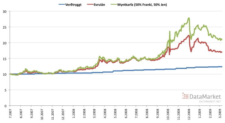 Smá DataMarket nördaskapur í morgunsárið. Hér er búið að teikna upp þróun 10 m.kr. láns frá 1. júlí 2007 (hátindi lánabólunnar okkar) m.v. þrenns konar mismunandi forsendur: ATH: Ekki er tekið tillit til afborgana eða vaxta, bara þróun á höfuðstól m.v. gefnar forsendur. Tölurnar á bakvið þetta (o...